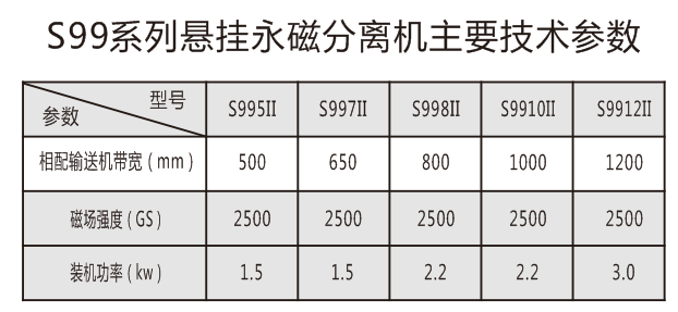 注:S95、S97、S99系列永磁分離設(shè)備,采用了高強(qiáng)磁性材料,具有磁性強(qiáng)、磁分離效果好、運(yùn)轉(zhuǎn)平穩(wěn)、 性能可靠等優(yōu)點(diǎn)